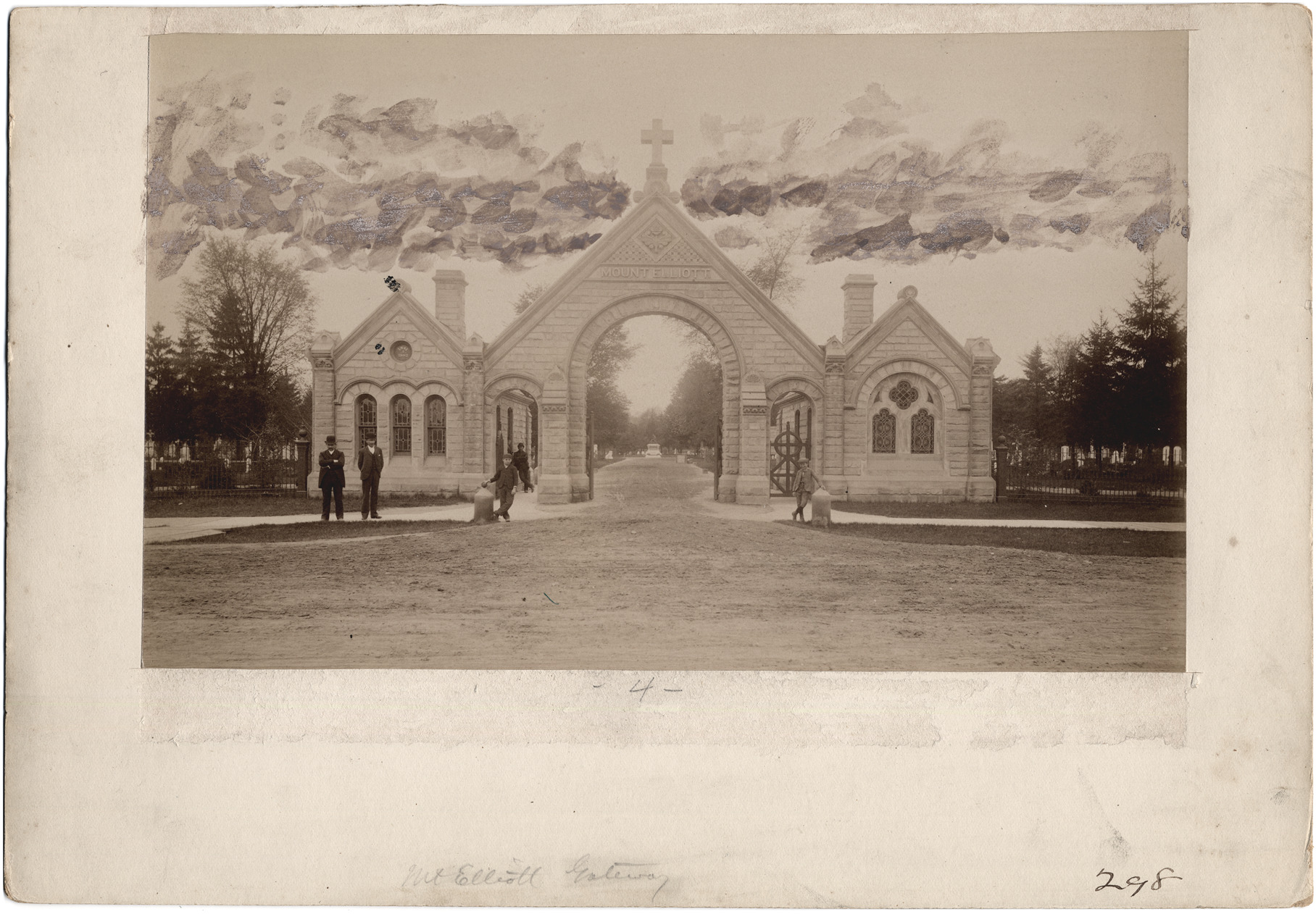 Arched gateway entrance to Mt. Elliott Cemetery. "Mount Elliott" carved in stone; stained glass windows. Graves in distance. A group of men and boys pose in front. Photo is retouched: has some coloring on top of photo. Handwritten on front: "Mt. Elliott Gateway." Printed on back: "From Alvord & Co., exclusively commercial photographers, 55 Rowland St., Detroit, Mich., ground floor."