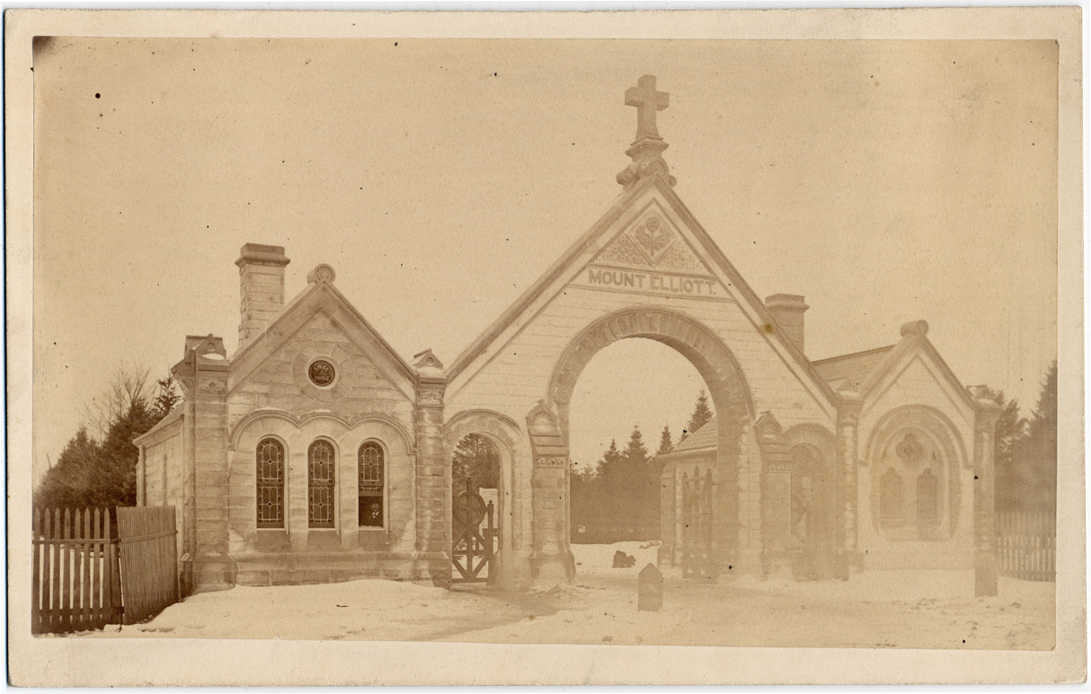 Favorite this☆ Entrance to Mount Elliott Cemetery Description: Arched gateway entrance to Mt. Elliott Cemetery. "Mount Elliott" carved in stone; stained glass windows; one window has dates 1841 and 1882. Snow on ground and man peering out of window. Handwritten on back: "Entrance to Mt. Elliott, 1882." Details Resource ID: DPA1915 Subject: Mt. Elliott Cemetery (Detroit, Mich.) Gateways--Michigan--Detroit Albumen prints Photographic prints Date Issued: 1882 Format: 1 photographic print mounted on mat board ; image 4.5 x 7.75 in. Member of: Burton Historical Collection Filing Location: D/Cemeteries-Mount Elliott Rights: Physical rights are retained by DPL. Copyright is retained in accordance with U.S. copyright laws.