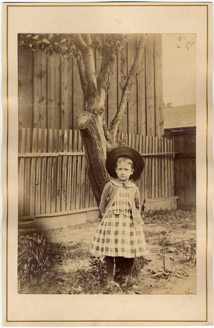 Girl in plaid dress with wide-brimmed hat posing by tree. Wooden fence in background.