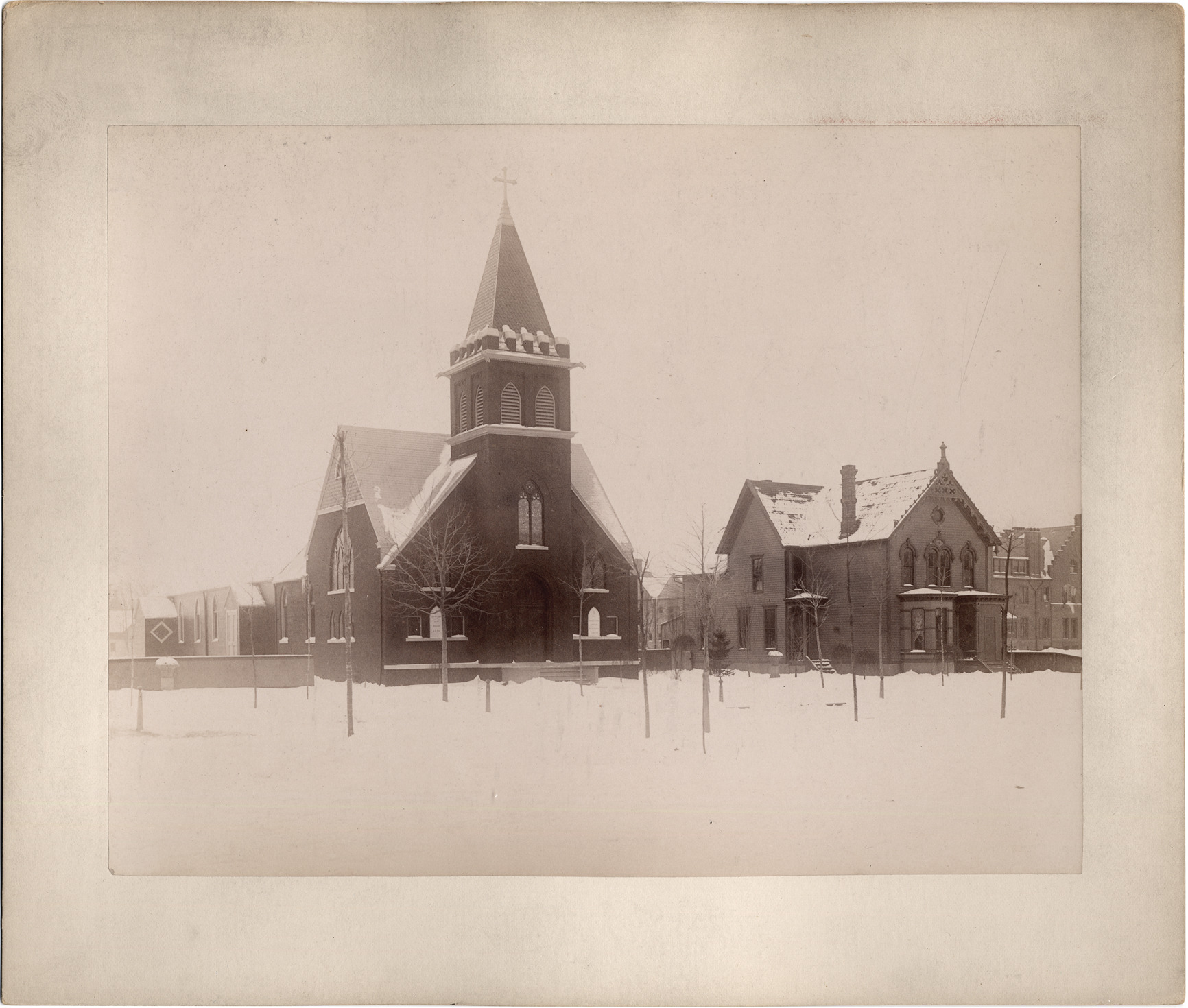 View of Our Lady of the Rosary Catholic Church, located at 60 Harper Avenue (formerly 32 Harper Ave.), between Woodward Avenue and John R. Two-story, wooden-frame house on right. Printed on back: "From Alvord & Co., exclusive commercial photographers, 55 Rowland St., Detroit, Mich., ground floor."