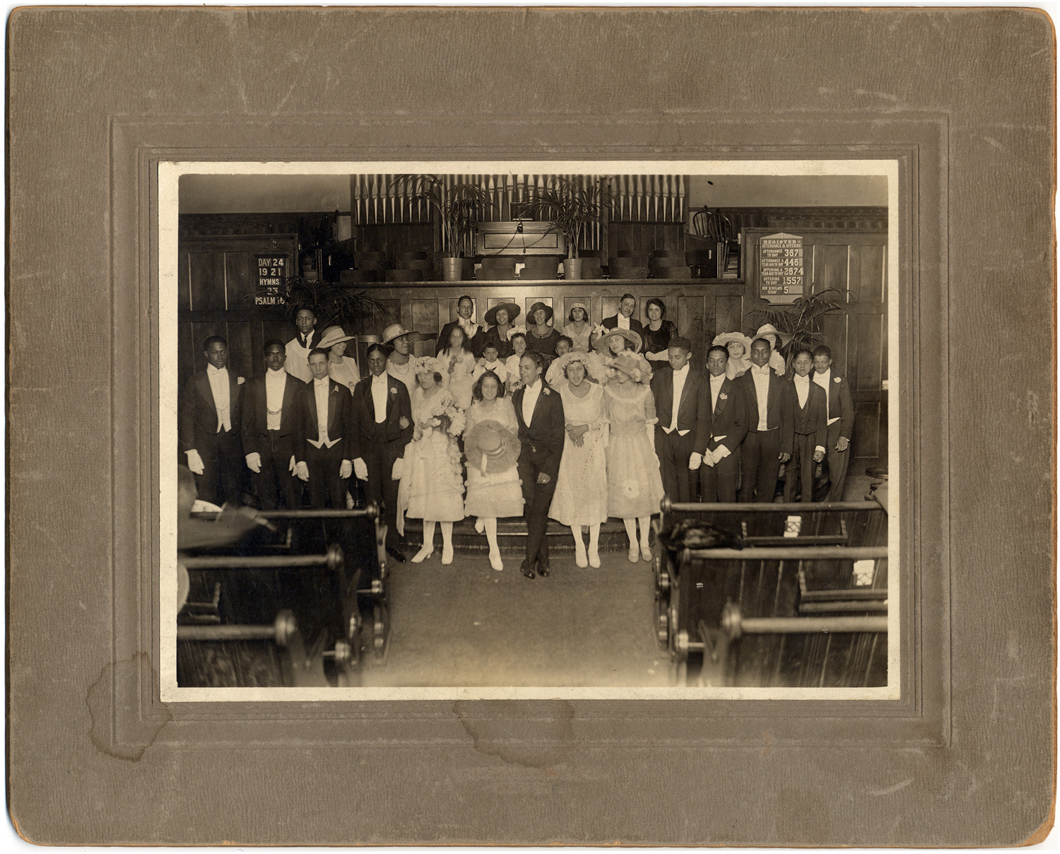Mock wedding at Bethel African Methodist Episcopal Church. Groomsmen dressed in black tuxedos, bridal party dressed in white dresses. Bride and groom in front. Printed on back: "Mock wedding - when Bethel AME church, was located northwest corner of Napoleon and Hastings sts. - 1921. Top row: L.R. - Dr. Chas. Green. Far R: Dr. D.W. Burton; Bessie Henson. 2nd row far R: (large hats) Mabel Webb, Ruth Webb. Front row, LR: 3rd from L. - Chas. Griffin, 5th from L. - Mabel Hunter, "Bride" Adelyne Hunter, "Groom" Harry Hayes, Ruth (Foster) Higgins, Leoto Cook, Jas. Ford, Lawrence Duncan, Dr. Postles, George Langston."