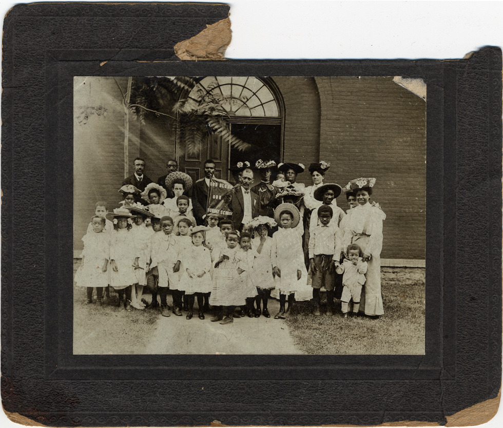 Large group of young children posing in front of church building. Mix of boys and girls, all wearing white, girl wearing wide-brimmed hats. Adult men and women, dressed in black, stand in background. One child holding a sign that says "God bless our Sunday School." Handwritten on back: "Sunday School, Class of 1902." Top portion of mat board is torn off.
