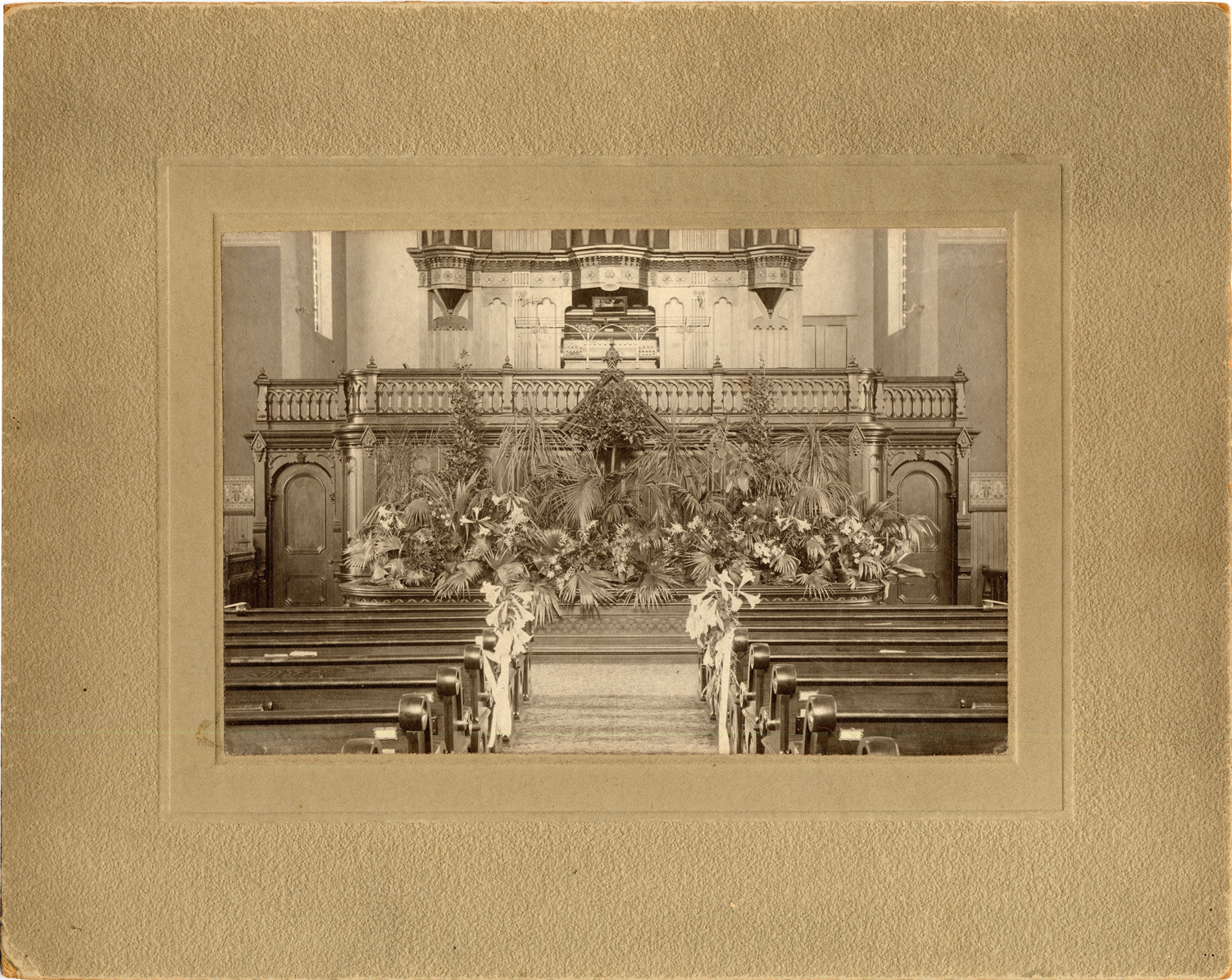 Large floral arrangement, primarily lilies, inside First Baptist Church. View of aisle between pews leading to altar. Organ in balcony above. Handwritten on back: "April 6, 1897. First Baptist Church, Detroit, Michigan. Blanche Vinton-Bach, A. Williams M.D., Clara Vinton, Earl Batty, Ella Pierson, Emma C. Watsfall, Waneu (?) Vinton, Robert Vinton, Jesse B. Davis, Louis Foux M.D., Buchanau(?) Patterson, Will Lowe, Frederich Alexander, Rev. D.D. McLaurie."