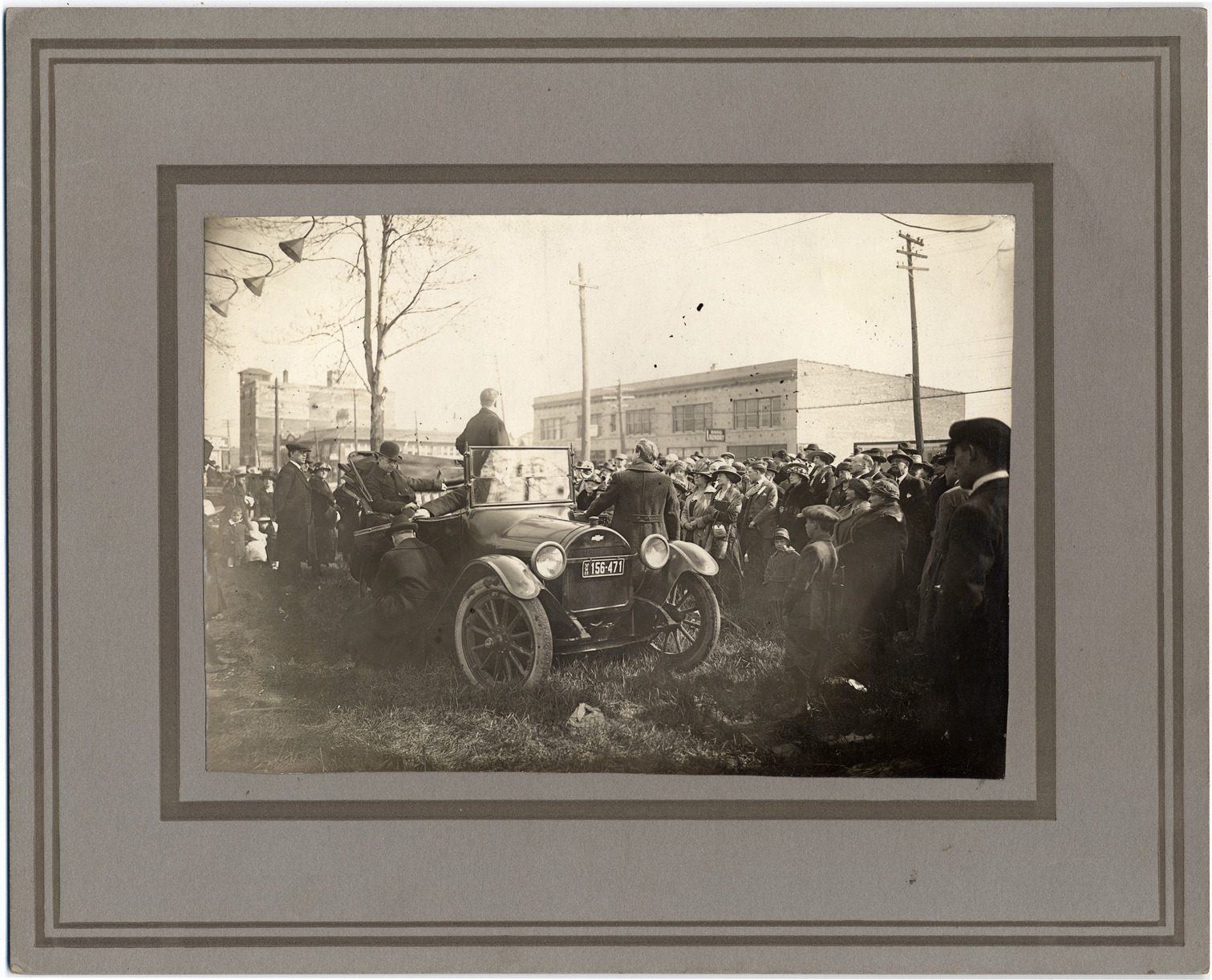 Crowd gathered on field around automobile. Man in black coat standing up in automobile; another sits in passenger seat; another stands beside automobile. Handwritten on back: "Dedication of site, Northwestern Baptist Church. Clarendon and Grand River Avenue, spring of 1922. In automobile are Rev. Llewellyn Brown, seated in back seat. Mr. Walter Smith, standing. Rev. Gleiss, behind windshield. Mr. Sherman Lister in running board."