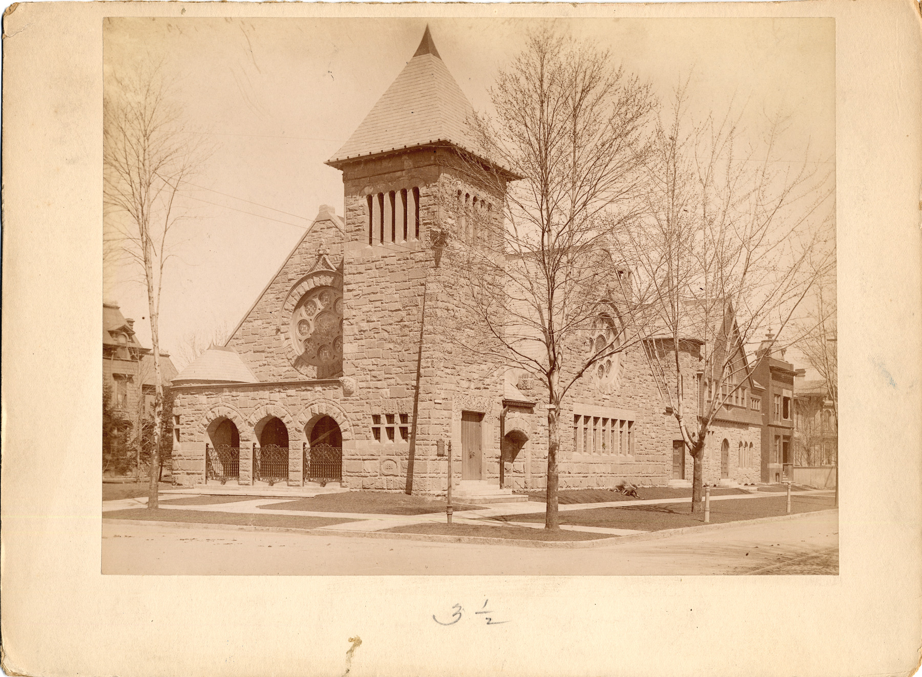 Stone church with bell tower and round stained glass window. Handwritten on back: "Church of Christ, Cass Park, N.E. Cor. Ledyard and Second." Printed on back: "From Alvord & Co., exclusively commercial photographers, 55 Rowland St., Detroit, Mich., ground floor."