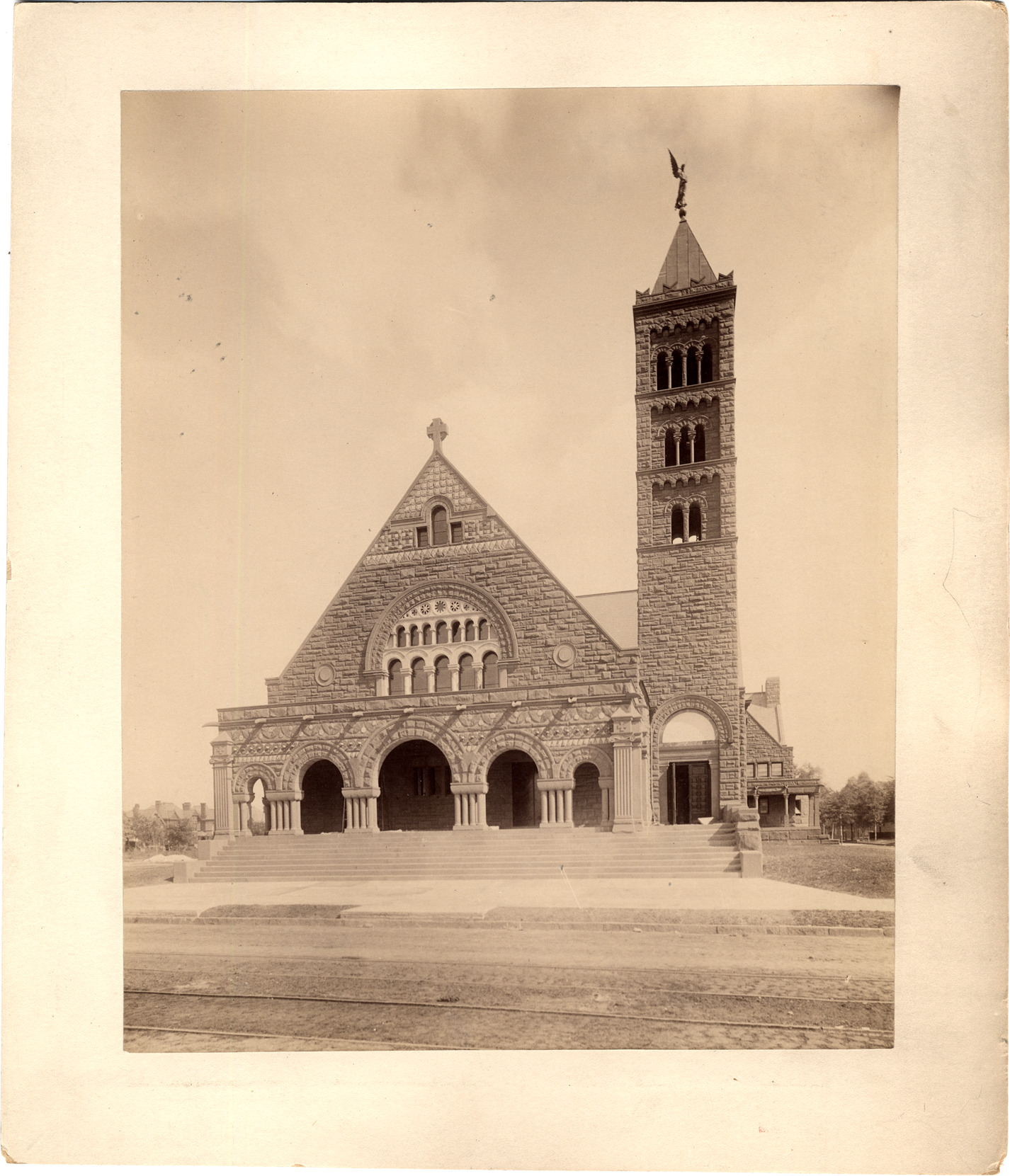 Front view of First Congregational Church. Dark stone building with tall spire, angel sculpture on top. Series of arches in front of entrance. Printed on back: "From Alvord & Co., exclusively commercial photographers, 55 Rowland St., Detroit, Mich., ground floor."