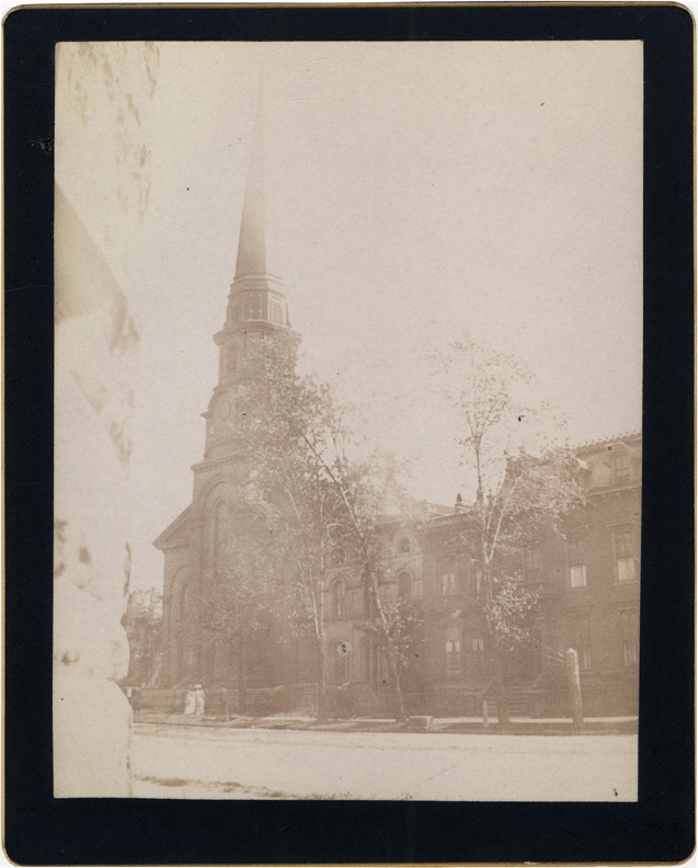 Brick church building with steepled bell tower behind metal fence, viewed from across street. Three houses to the right of church, edge of building to left cuts into image. Several people walking on sidewalk toward church door. Handwritten on mat back: "Fort St. Congregational Church - just prior to removal of steeple. Oct. 1892. West side of Summit St. South of Fort. S.w. corner of Fort & Wayne."