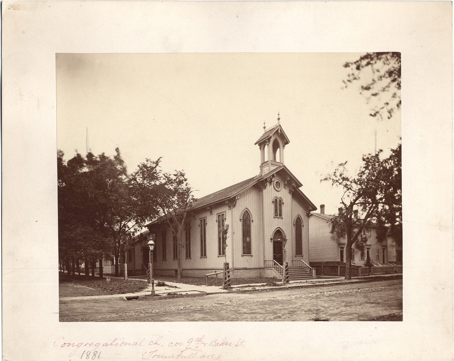 Wooden frame church building, batten-and-board on brick foundation, with cupola. Viewed across cobbled street with trolley tracks. Houses beside and behind, trees along streets, saplings in protective frames front and side, lamppost on corner. Text handwritten on mat front: "Congregational ch. cor. 9th (Trumbull ave) & Baker St., 1881" Handwritten on mat back: "Trumbull Ave. Congregational Church, n.w. cor. Trumbull Ave. & Baker."