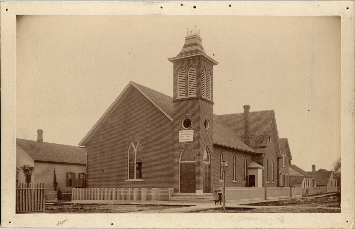 Brick church building with bell tower, behind picket fence and board sidewalks. Buildings behind, lamppost on corner. Two children at corner, another near end of church ground. Banner on bell tower over door: "Diese Kirche wird nachsten Sontag durch den Ehrw. Bischof T. Bauman, eingeweiht werden." Handwritten on mat back: "New Bethel Em. Church, Catherine & Dubois, 1882."