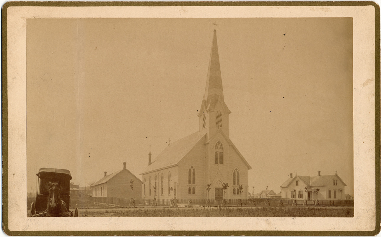 White brick church with tall spire, topped with cross. Tall Gothic-style windows. Wooden structures support young trees in front. Residential houses in background; horse-drawn vehicle in foreground. Handwritten on back: "Zion Lutheran Church, school, parsonage. West side Welsh Ave. Springwells, one block north of Mich. Ave."