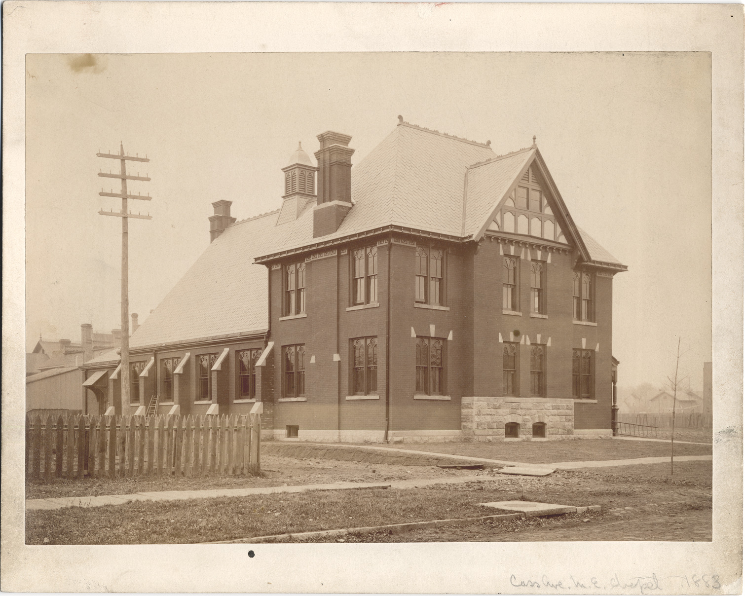 Brick church building with stone foundation. Tudor-style half-timbering, buttresses on hall, cupola. Unpaved road and board sidewalk, utility pole. Buildings in distance, picket fence in foreground. Handwritten on mat front: "Cass Ave. M.E. Chapel, 1883." Handwritten on duplicate mat back: "Cass Ave. M.E. Chapel, 1881. Cass & Selden Ave."