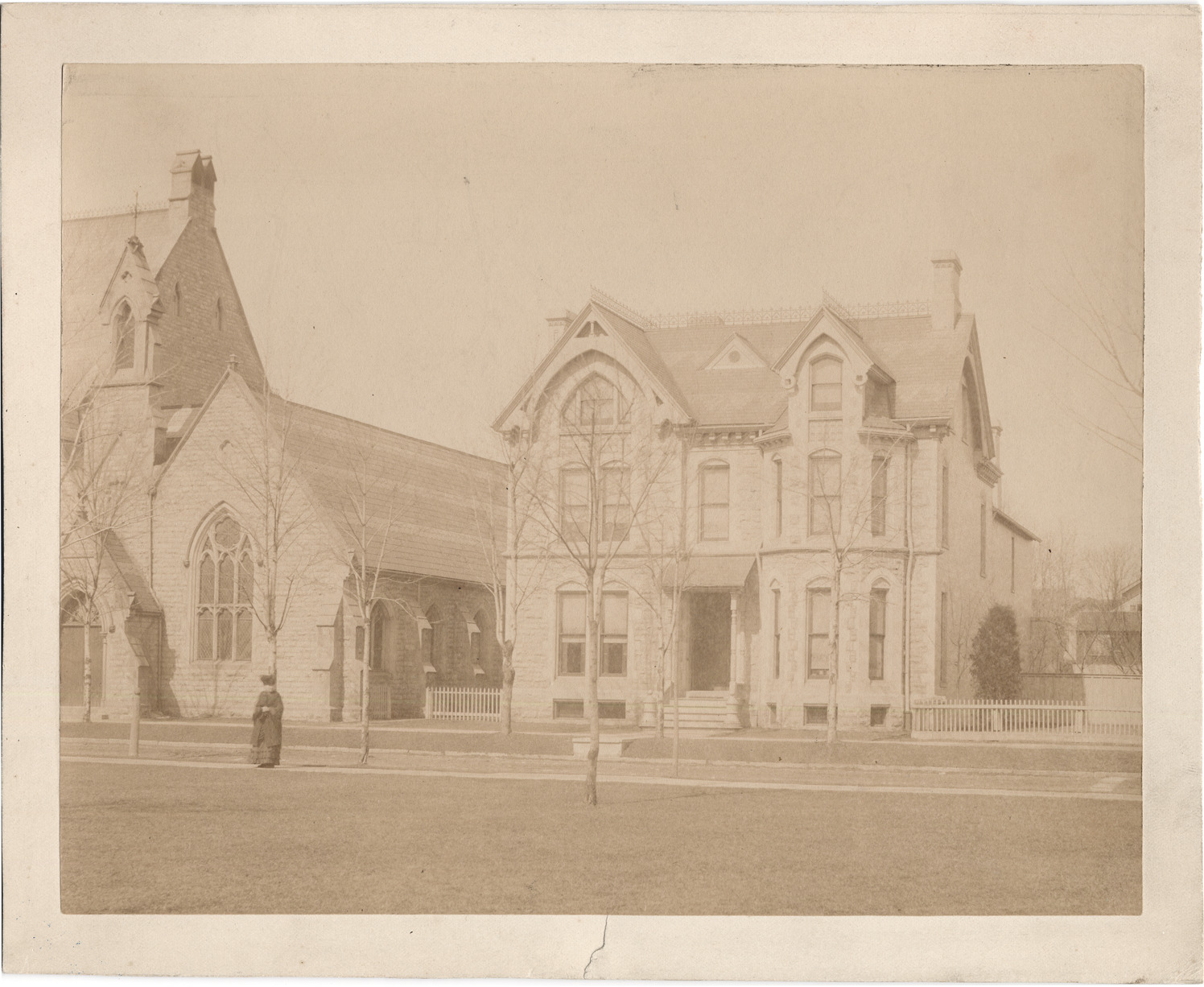 Side of stone church building with stained glass windows, with Victorian parsonage, viewed across street. Leafless saplings in foreground, with woman dressed in dark clothes on sidewalk. Handwritten on mat back: "Central M.E. Parsonage, 29 Adams Av. E."
