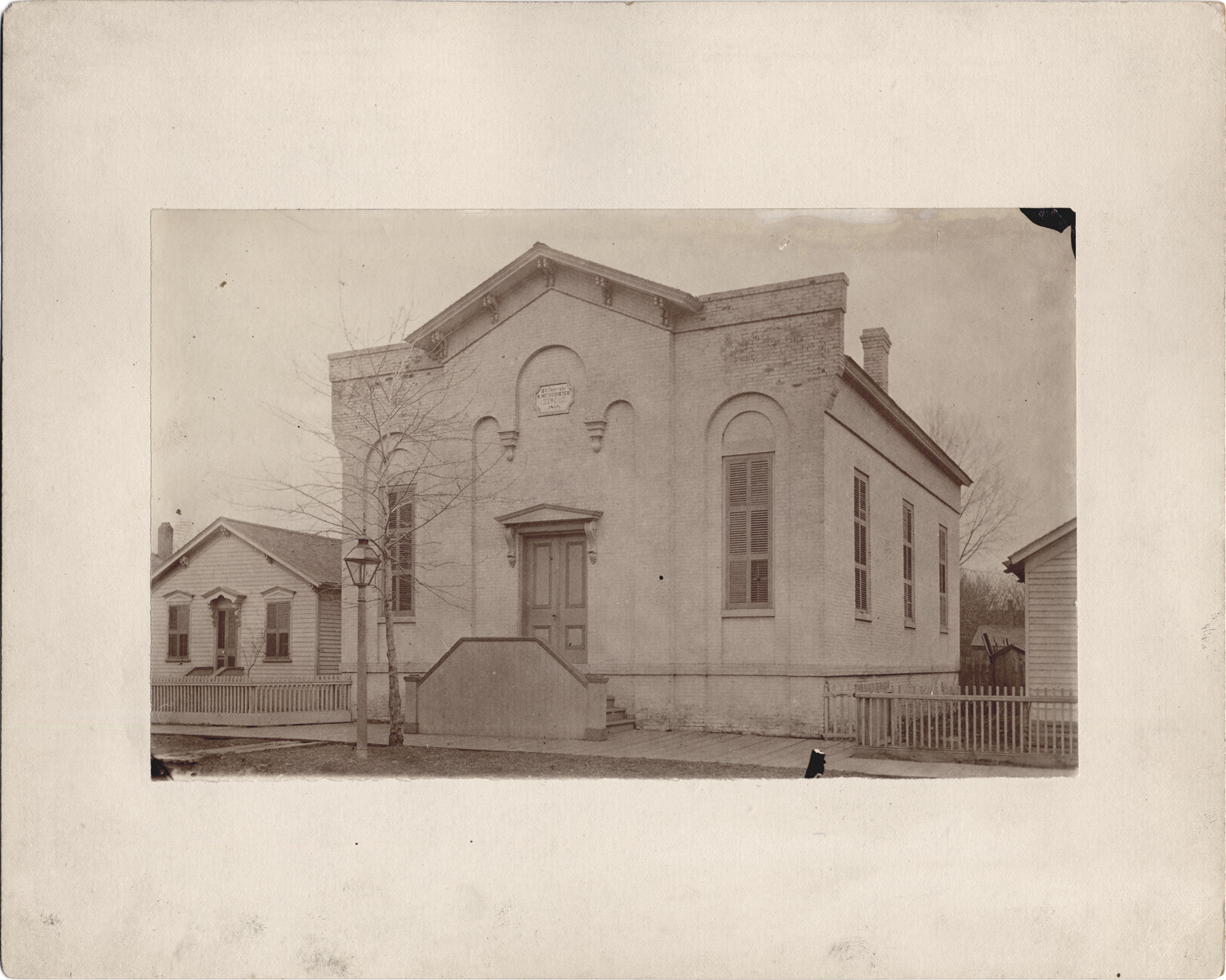 One-story brick church with false front, built directly on wooden sidewalk. Arched detail over front door and windows. Sign on building front: "2n Deutsche B. Methodisten Kirche, 1858." Picket fences around neighboring houses. Handwritten note on mat back largely obscured: "[?] about 1880."