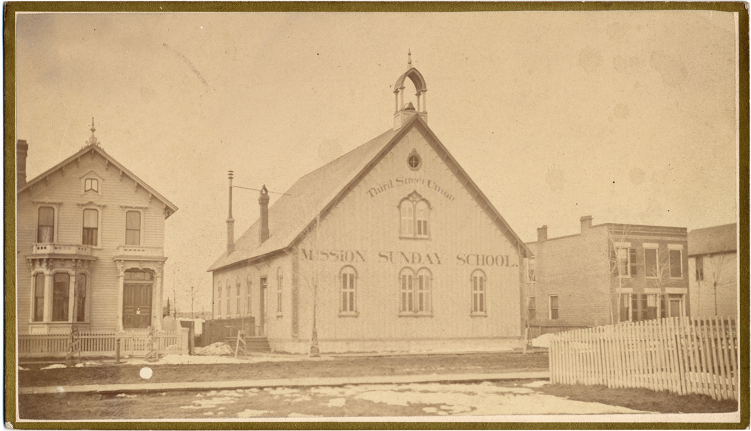 Wooden frame building with bell cupola, viewed across unpaved street. Buildings visible on both sides. Patchy snow on ground. Written on school front: "Third Street Union mission Sunday school." Handwritten on card back: "Third Street mission school, 1882."