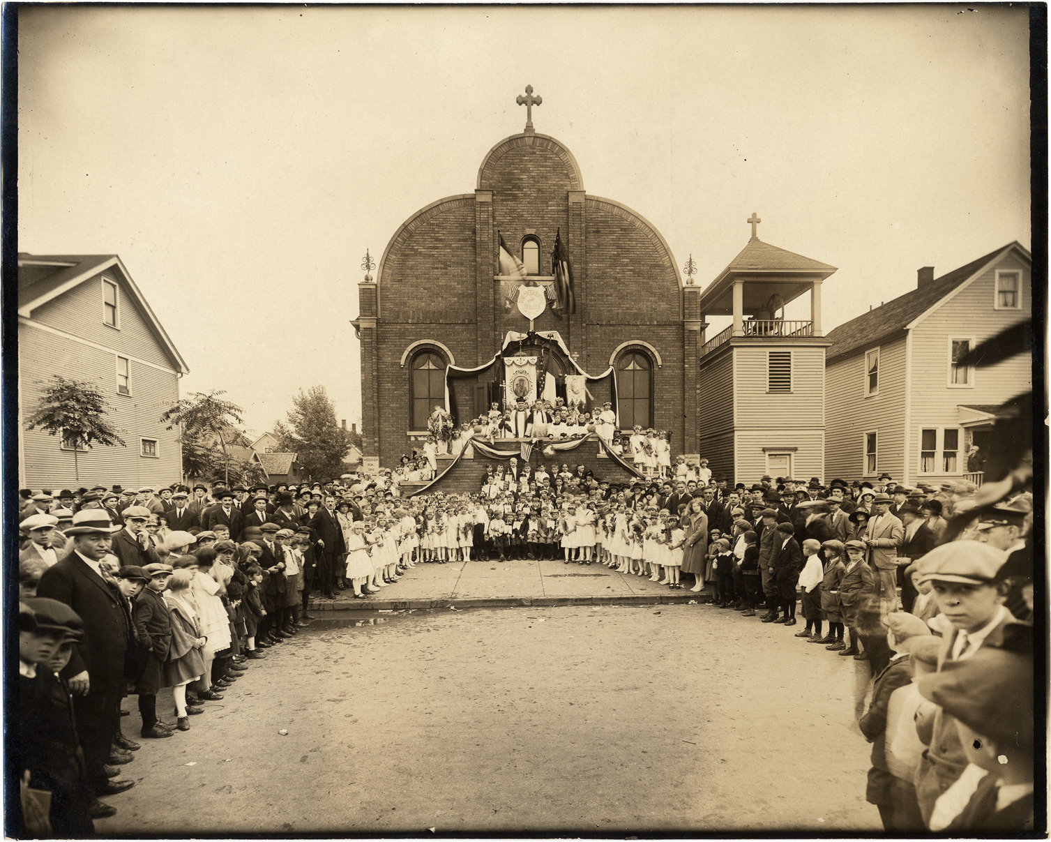 Large crowd on steps and in front of brick church with clapboard bell tower. Banners by church door behind clerics. Many girls in white dresses and boys around the steps. Handwritten on photograph back: "Our Saviour on Golgotha, 5272 Chopin Street, Detroit. Visit of Bishop Hodur to Detroit, c.1923. Jakubowski Studio, 6743 Michigan Ave., Detroit."