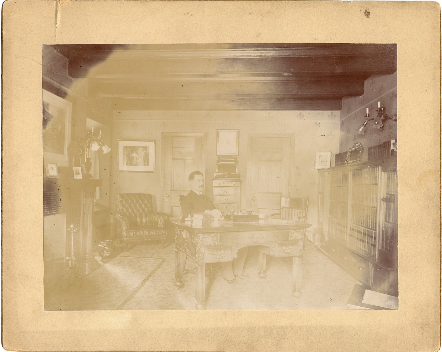 Favorite this☆ Study and library in First Presbyterian Church Description: Mustached man seated behind desk in room with bookshelves and fireplace. Handwritten on mat back: "Study and library, 1st Presyterian Church, Detroit, Mich." Details Resource ID: DPA2037 Subject: First Presbyterian Church (Detroit, Mich.) Presbyterian church buildings--Michigan--Detroit Albumen print Photographic prints Date Issued: Unknown year Format: 1 photographic print mounted on mat board ; image 6 x 8 in. Member of: Burton Historical Collection Filing Location: D/Churches-Presbyterian-First (1896) Rights: Physical rights are retained by DPL. Copyright is retained in accordance with U.S. copyright laws.