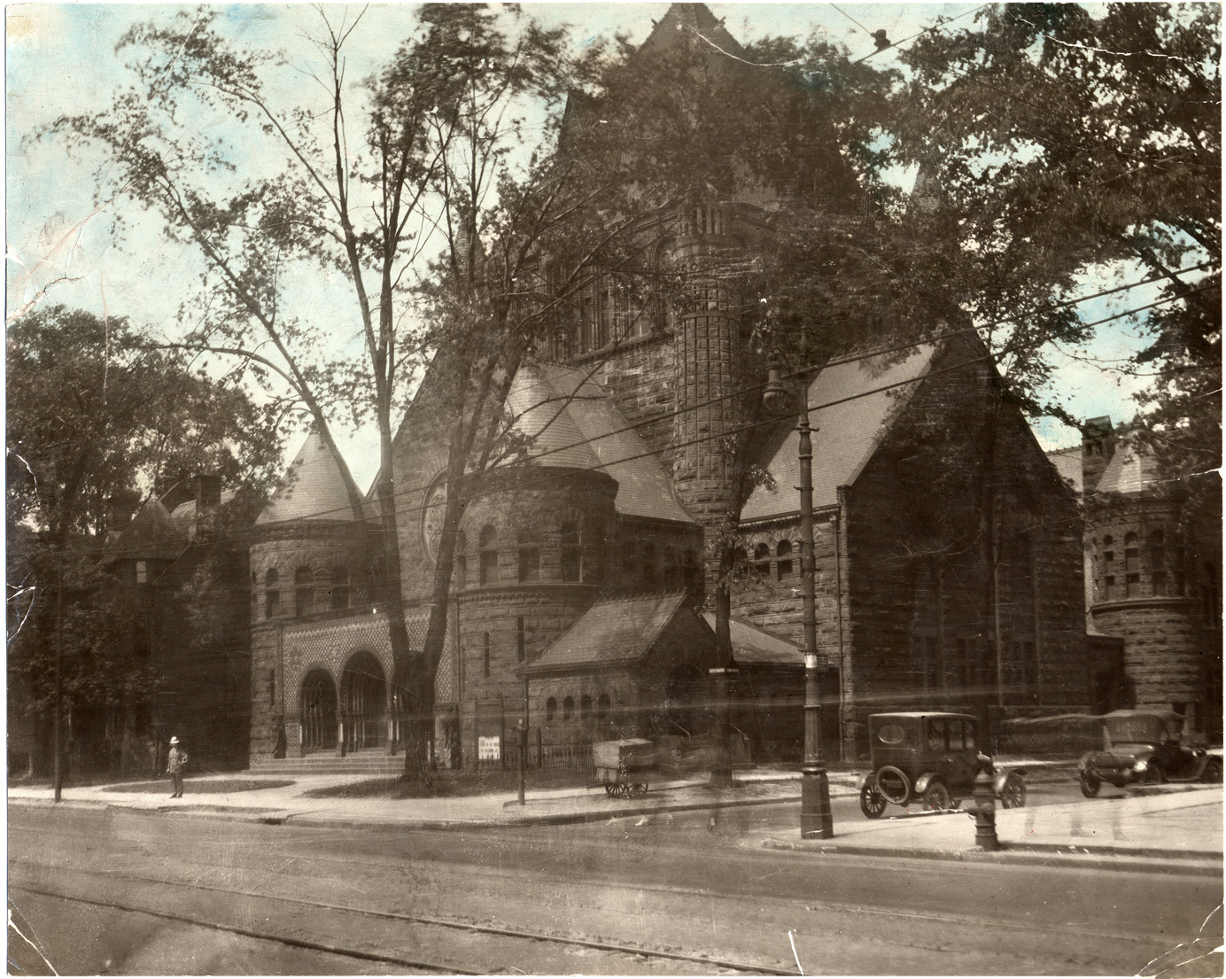 Favorite this☆ First Presbyterian Church Description: Church viewed at an angle across Woodward; trees and utility poles in front of church, trolley tracks in street. Houses behind. Cars parked on side street; cart on sidewalk by church. Man stands in front of main entrance. Sky colored blue. Details Resource ID: DPA2038 Subject: First Presbyterian Church (Detroit, Mich.) Presbyterian church buildings--Michigan--Detroit Cornerstone laying--Michigan--Detroit Photographic prints Date Issued: Unknown year Format: 1 photographic print ; 7.5 x 9.25 in. Member of: Burton Historical Collection Filing Location: D/Churches-Presbyterian-First Rights: Physical rights are retained by DPL. Copyright is retained in accordance with U.S. copyright laws.