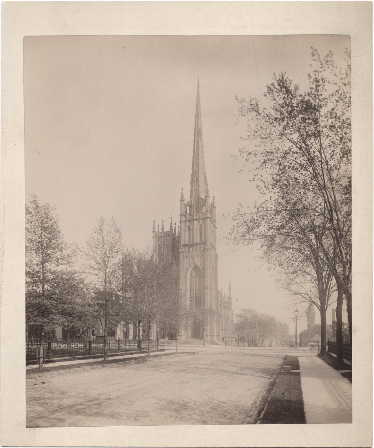 Church viewed at an angle across intersection of Third Ave. and Fort St.; trolley tracks down Third. Metal fences on both near corners; trees with new leaves. Stamped on mat back: "From Alvord & Co. exclusively, commercial photographers, 55 Rowland St., Detroit, Mich., ground floor gallery." Handwritten on mat back: "Fort St. Presb. Ch., Fort and 3rd."