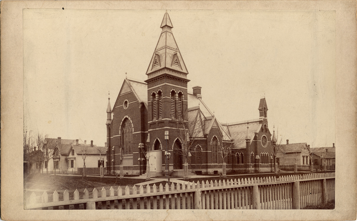Memorial Presbyterian Church. Dark brick building with light brick roof and lighter accents around windows, doors. Tall steeple in corner of church with protruding entrance underneath. Large arched stained glass window on front of building. Residential neighborhood seen in background. Handwritten on back: "Memorial Church, Presbyterian, Clinton and Jos. Campau Ave., 1882."