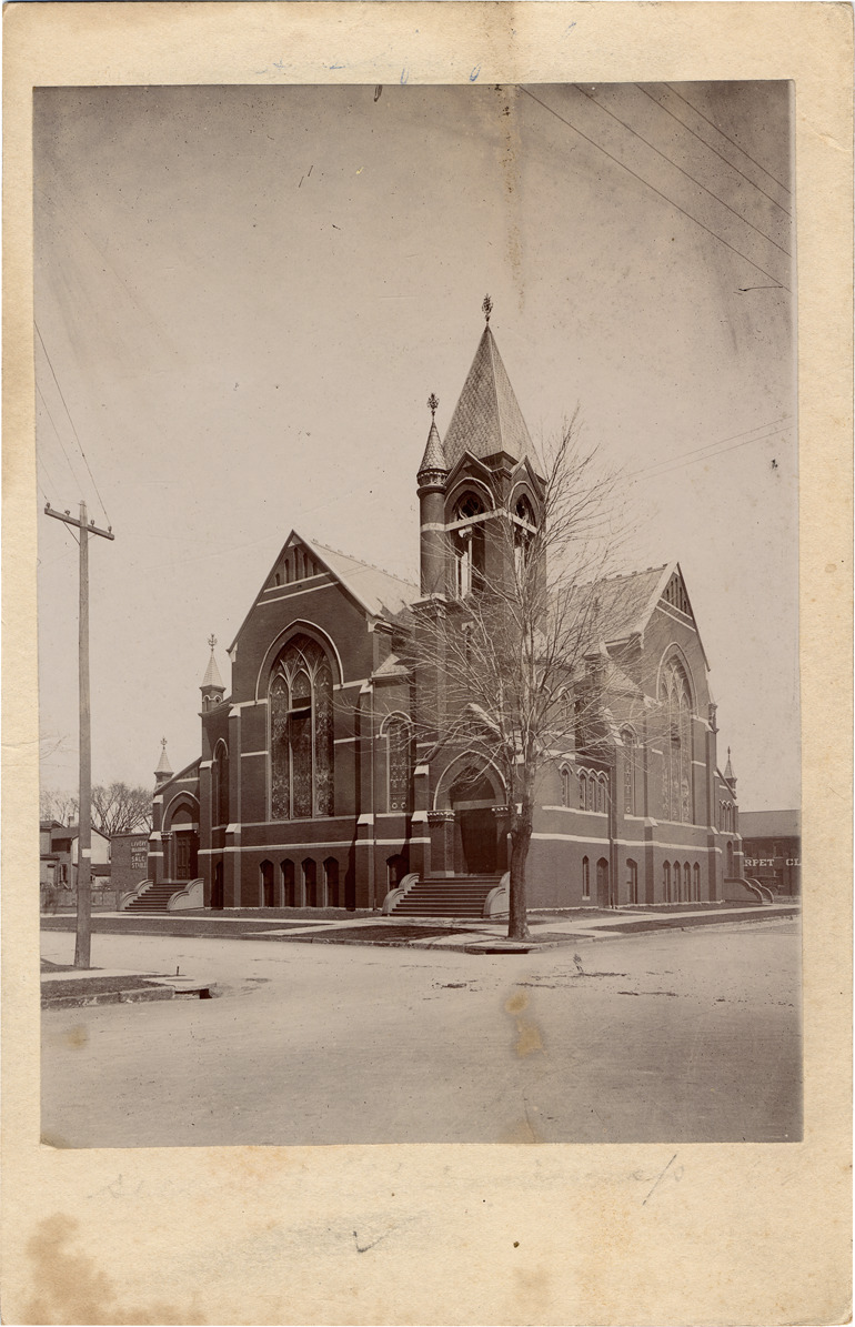 Dark brick building, two large stained glass windows on front and side of building with ornate design visible in photograph. Two entrances, on left and right sides of building. Tall steeple with spire protruding from side. Handwritten on back: "Second and Gilman (now Columbia), 1900."
