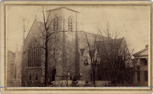 Stone church, Latin cross-shaped, with bell tower. Viewed across street, behind metal fence and leafless trees. Palladian house beside. Printed on card back: "Roberts & Dodge, photographers, 159, Jefferson Ave., Detroit." Handwritten on card back: "Old Christ Church, Detroit."