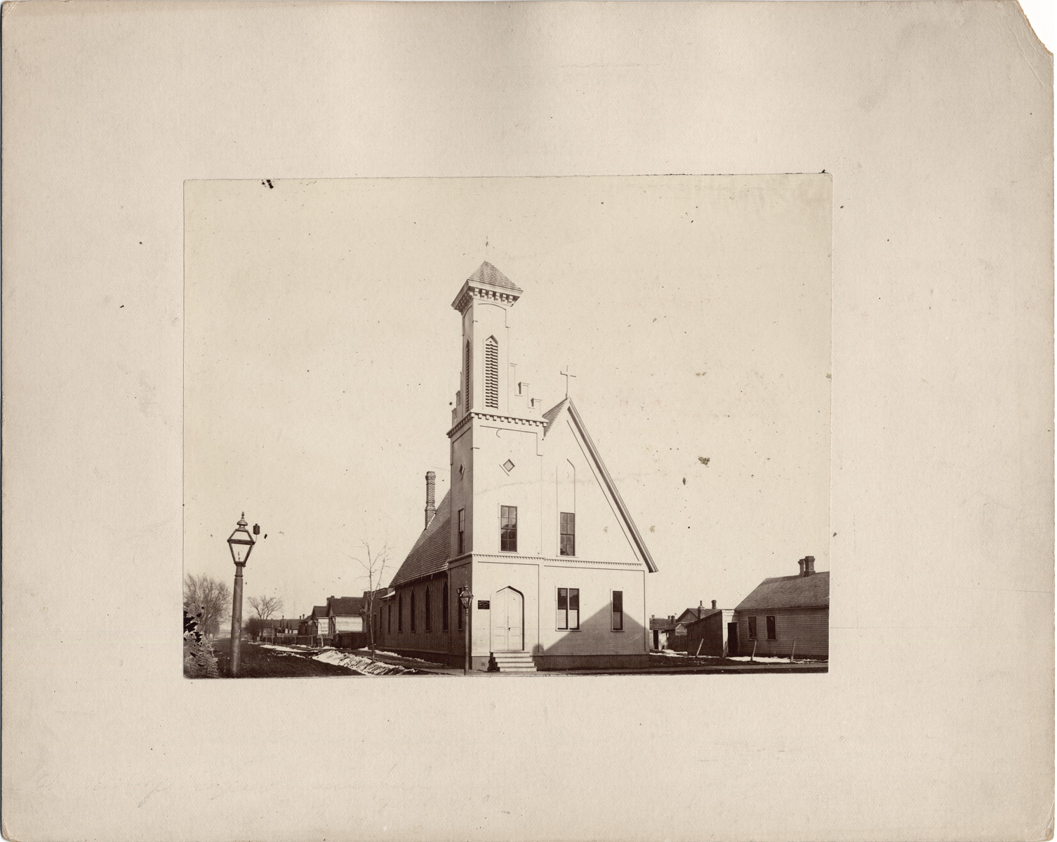 Small white-paneled church with tall steeple in left corner, entrance underneath. Tall plain glass windows, cross on peak of roof. Residential neighborhood in background. Handwritten on back: "St. Mary's Episcopal Chapel 1881, Benton St., S.E. Cor. St. Antoine St. and Benton."