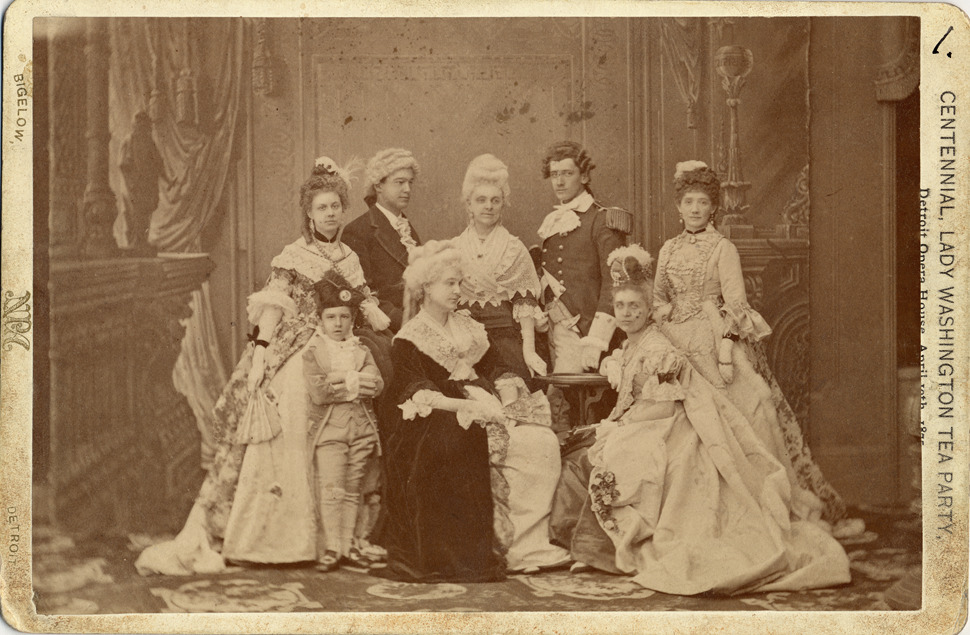 St. Paul's Episcopal Church Guild reenact tea party in period costumes. Printed on front: "Centennial, Lady Washington Tea Party, Detroit Opera House, April 19th 1875. Bigelow, Detroit." Handwritten on back: "L. to R.: Mrs. L.H. Batter, Mrs. Charles Lathrop, Mrs. Angela (wife of President Augill), M. Fred Sibley, Ms. Davenport (aunt of Wm. L. Russel), Mrs. P.J.N. Lathrop, Mrs. W.J. Chittenden."
