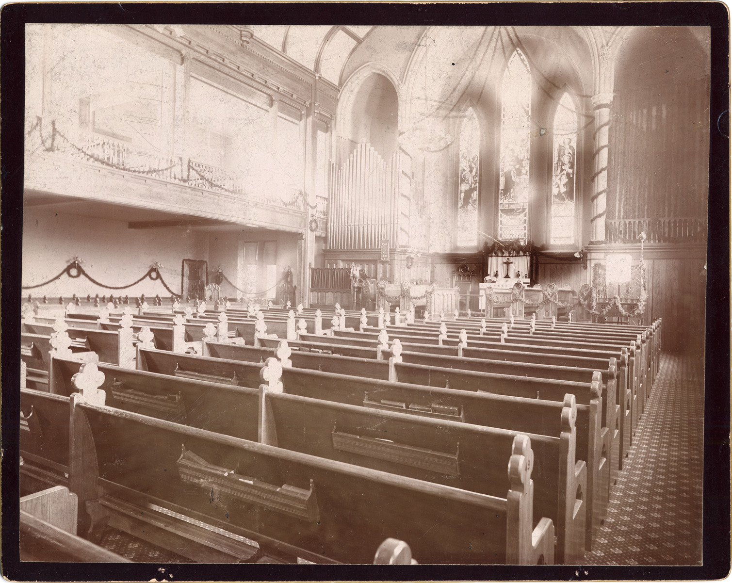 Interior of St. Paul's Memorial Chapel, built in 1895 at the corner of Woodward Ave. and Hancock. The congregation of St. Paul's, at the time this photograph was taken, worshiped in a church at Shelby and Congress, built in 1852. Chapel is decorated with garland and wreaths. Details of stained glass window and organ pipes; pews in foreground; photo looks toward altar. Back of photo has drawing of St. Paul's Memorial Chapel and short newspaper article, describing a Memorial Tablet placed in the church. Tablet inscription: "This building was erected in loving memory of Anna Eliza Eaton, Born March 4, 1816, died November 5, 1879, by her son, Theodore H. Eaton, A.D. 1895."