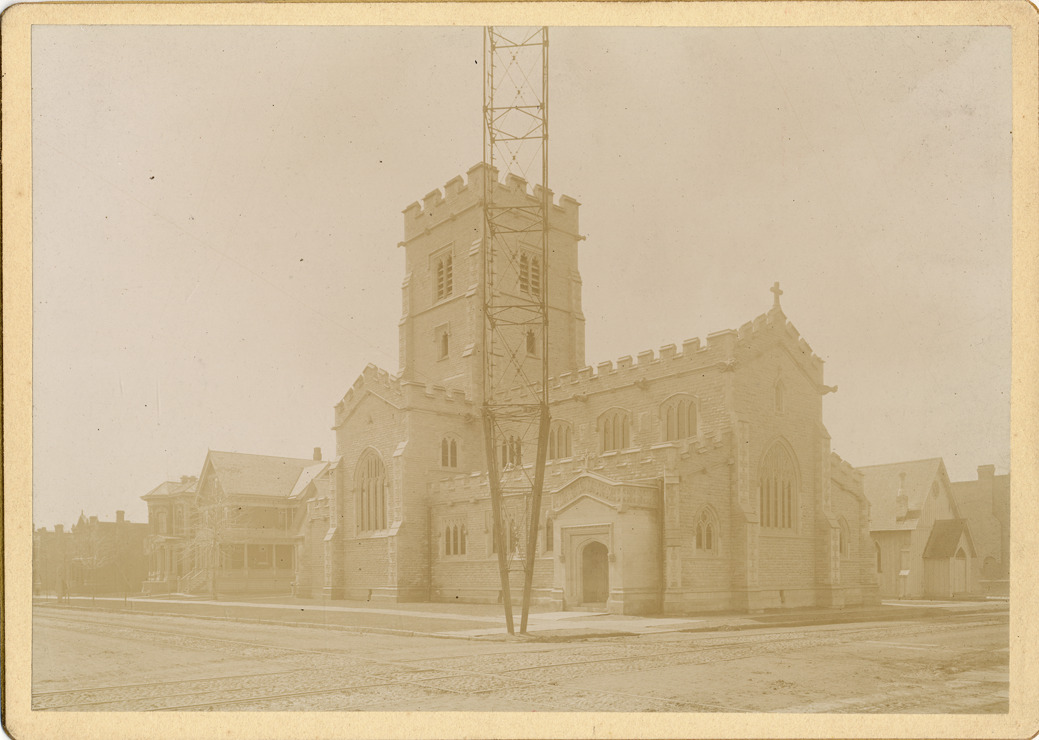 Trinity Episcopal Church, on the corner of Grand River and Myrtle. Dark brick church building, arched windows, square bell tower in back. Standing metal structure in front of church. Residential neighborhood in background.