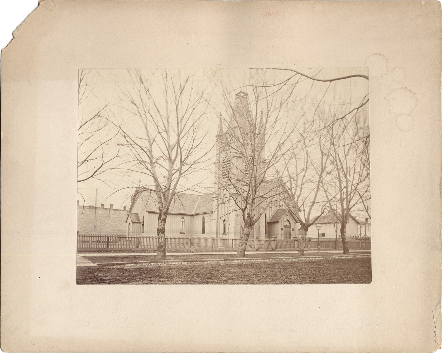 St. Peter's Episcopal Church, on the corner of Trumbull Ave. and Church St. Light paneled building with large bell tower and steeple. Wooden fence and trees in foreground.