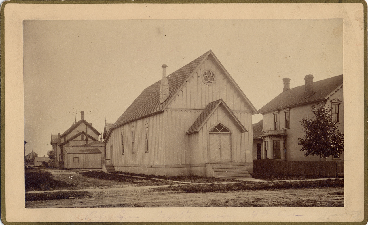 Epiphany Episcopal Church, on the corner of Myrtle and Trumbull. Small wood-paneled church building, with small round glass window above entrance and chimney on left side of roof. Residential neighborhood in background.