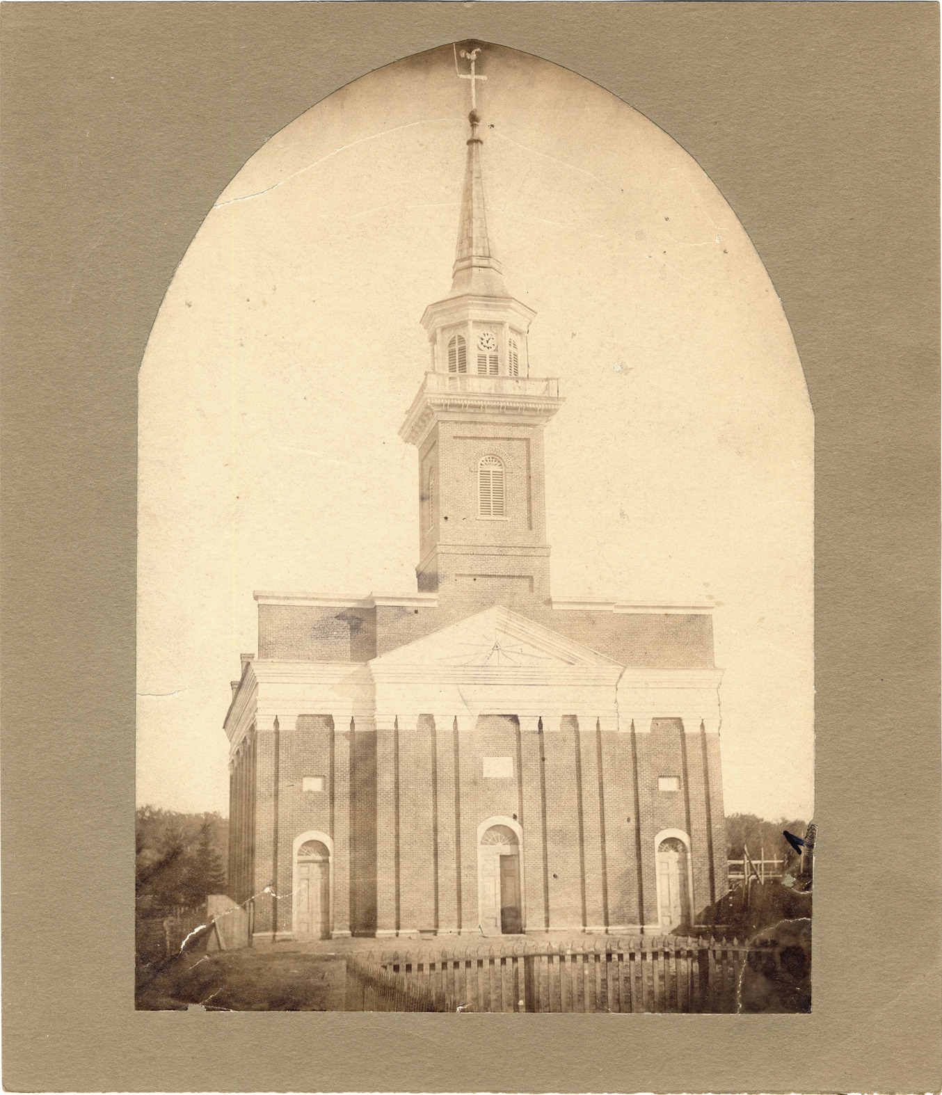 Church of the Assumption, on south side of Gratiot Ave. one block east of Grotto Ave. Dark brick building with tall steeple in center, clock on bell tower, cross on top. Handwritten on back: "Gratiot Ave. near 7 Mile Road. Burned about 1896. Richard Pulcher, organist for 30 years. He died Nov. 1, 1889. Brother of Rev. James Pulcher. He, Richard, also taught both Catholic and Public schools for 30 years."