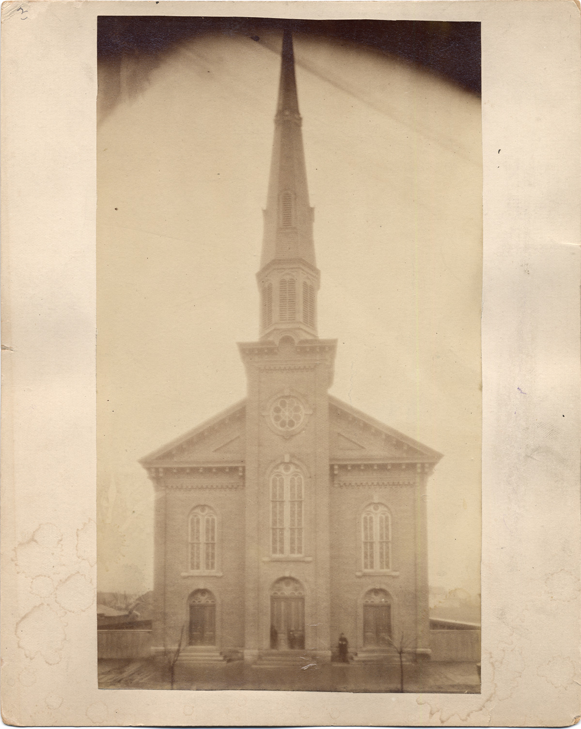 Front view of Sacred Heart Catholic Church. Church has three entranceways, tall arched windows, round glass window below tall steeple. Handwritten on back: "Sacred Heart Catholic Church, 1881, S.W. corner of Prospect and Grove Sts."