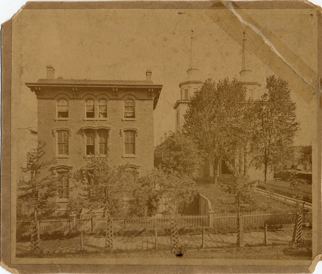 Two buildings side by side on Larned Street: on the left, the priest's residence, built by Bishop Frederick Rese around 1833. On the right, partially obstructed by trees, Ste. Anne's Church with two tall spires. Photo has tear in upper right-hand corner, which is repaired with tape.