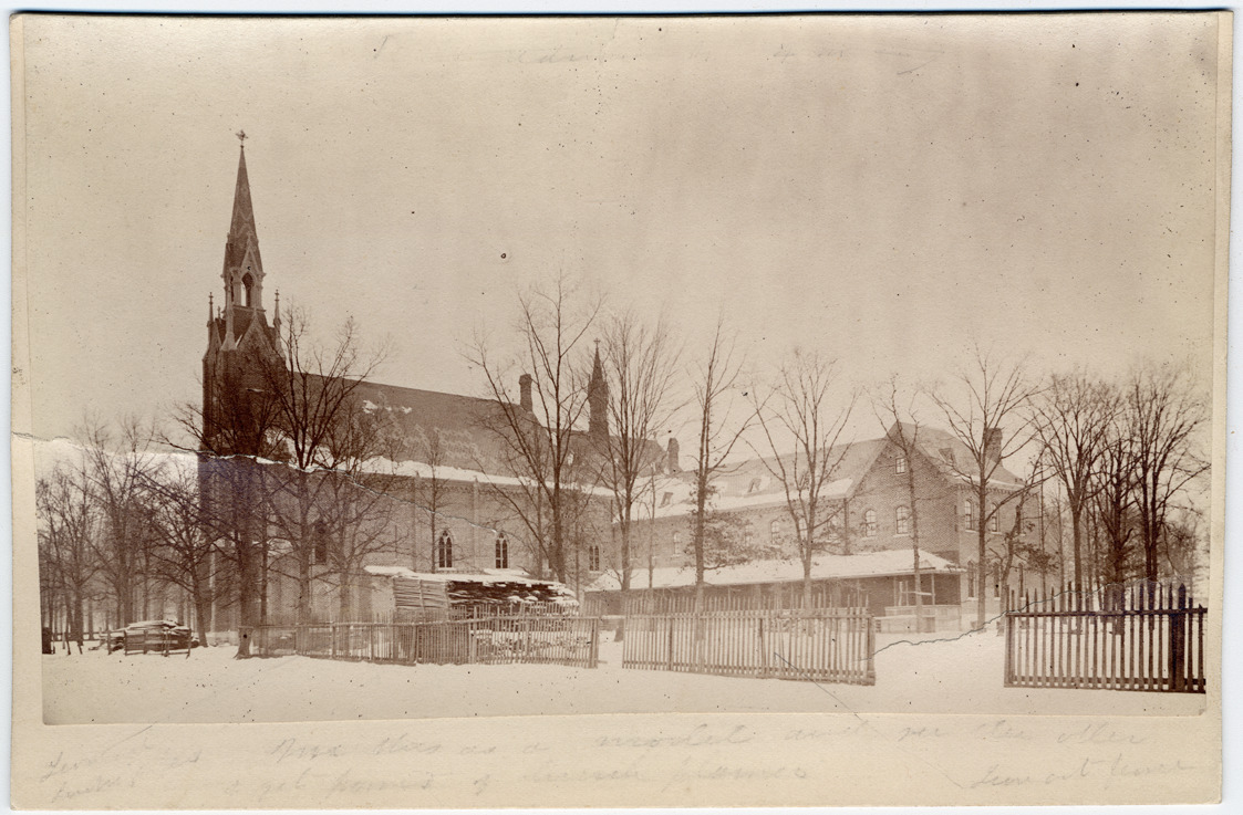 Brick Gothic-style church with monastery wing, viewed at an angle behind partially-constructed picket fence and leafless trees. Stacks of lumber. Snow on ground and roofs. Handwritten on mat back: "St. Bonaventure Church & monastery, 1883-. Opp. entrance to Mt. Elliott Cemetery."
