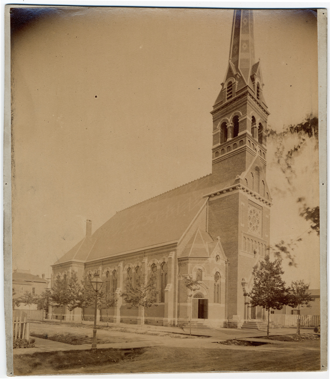 Brick church, viewed at an angle across street. Bell tower with tall steeple. Small trees by church, larger tree near camera, wooden sidewalks, lamppost. Houses beyond church. Handwritten on mat back: "St. Boniface Catholic Church, 1881 [sic]. S.e. cor. 13th & High Sts."