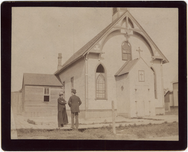 Clapboard church with vestibule and bell tower viewed at an angle. Pastor in cassock talking to another man, on wooden sidewalk near entrance. Wooden buildings beyond. Handwritten on card back: "St. Charles Church on Townsend Ave and the pastor Ch. Dennissen. July 1892."