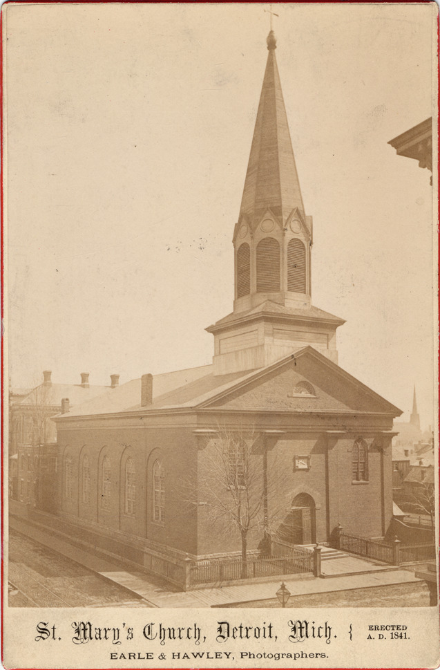 Brick church with steeple behind picket fence, viewed at an angle from a height across street. Other buildings behind church. Tree in front of church. Lampposts, and cornices of building on right edge. Printed on photograph front: "St. Mary's Church, Detroit, Mich., erected A.D.1841. Earle & Hawley, photographers." Handwritten on card back: "S.e. cor. St. Antoine St. and Croghan (now Monroe). St. Mary's Ch. (R.C.) German - Father Kundig, pastor."