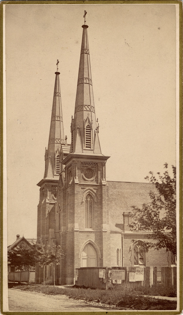 Brick church with twin steeples, viewed at an angle across unpaved street. Board fences around side yards, trees in yards and in front of church. Other buildings behind church. Printed on photograph back: "New series, panoramic and cabinet sketches, in and about the city of Detroit. Photographed and published by Jex Bardwell, 31 Monroe Avenue." Handwritten on card back: "St. Patrick's, Adelaide & John R, now Ss. Peter & Paul Cathedral, 1881."