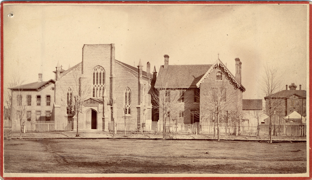 Brick church behind picket fence across unpaved street. Brick house beside, other houses behind. Leafless trees along street. Printed on card back: "New series. Panoramic and cabinet sketches, in and about the city of Detroit. Photographed and published by Jex Bardwell, 31 Monroe Avenue." Handwritten on card back: "St. Vincent de Paul Catholic Church, s.e. cor. Dalzelle & 14th Ave., 1880."