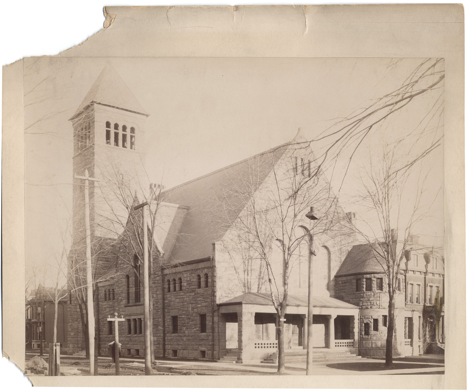 Stone church with square tower viewed at an angle across intersection. Houses around and leafless trees. Stamped on mat back: "From Alvord & Co., exclusive commercial photographers, 55 Rowland St., Detroit, Mich., ground floor gallery." Handwritten on mat back: "Woodward & Edmund Place." Mat torn at corners.