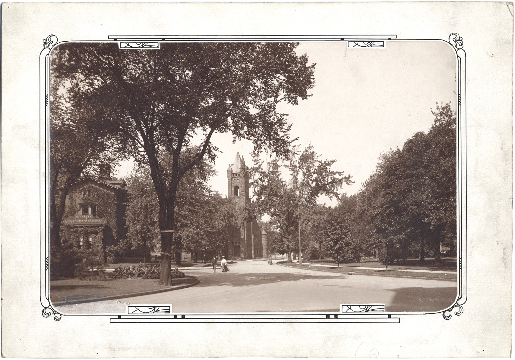 Stone church with open square tower and closed round tower behind leafless trees, viewed at an angle along Grand Circus Park. Vine-covered building "Michigan Conservatory of Music." Typed on label on mat back: "Church of Our Father (site of Tuller Hotel). Michigan Conservatory of Music (site of Statler Hotel)." Handwritten on card back: "Church of Our Father. Present site Tuller Hotel 1921. N.w. cor. Park & Bagley. Michigan Conservatory of Music. Present site Statler Hotel, 1921. Formerly the Bagley House. Washington Ave. cor. Park."