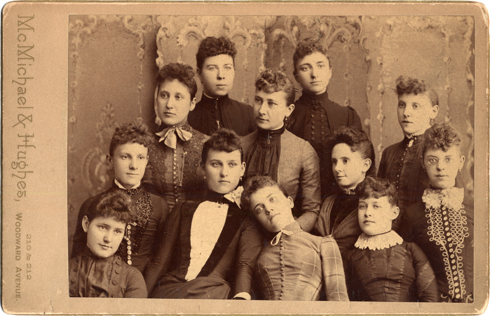 Twelve young women posed against backdrop. Printed on card front: "McMichael & Hughes, 210 & 212 Woodward Ave." Handwritten on card back: "c.1890. Victoria Wagstaff, Bertha Koch, Ella A. McMilliman, Cora Downey?, Barbara Ortwine, Eliza Ringel, Tillie Brown, Mary F. Sevigne, Anna Buckley, Annie Young." 1890 Detroit City Directory lists photographer Alfred G. McMichael at 152 and 210 Woodward.