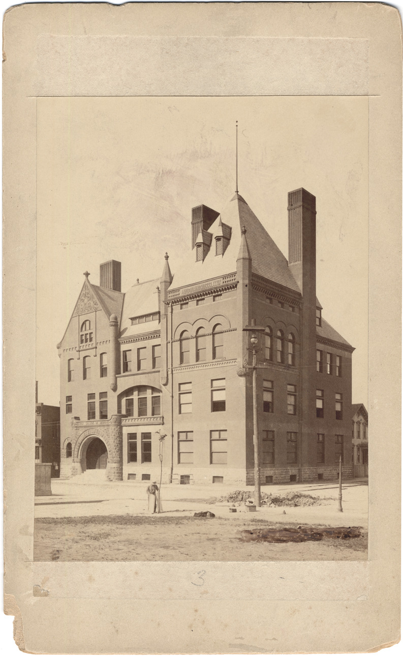 Brick building with arched windows and entry. Person standing by stunted sapling. Written over entry: "Detroit College of Medicine." Written near roof: "Anno Domini MDCCCLXXXIX." Stamped on card back: "From Alvord & Co., exclusive commercial photographer, 55 Rowland St. Detroit, Mich. Ground floor gallery." Handwritten on mat back: "Detroit College of Medicine, c.1890. 343. N.e. cor. St. Antoine & Mullett."