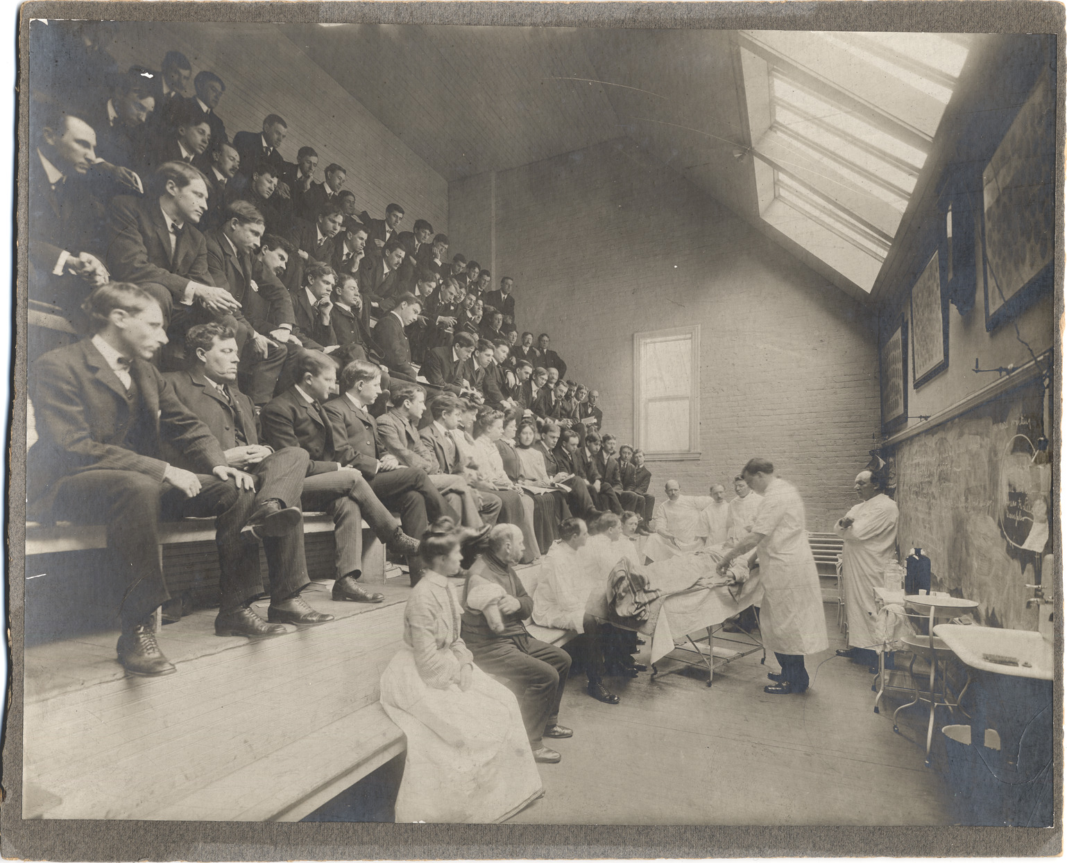 Favorite this☆ Operating theatre with large audience Description: Operation in front of audience on banked seats, mostly men. Man sitting in front row missing most of right arm. Skylights, blackboard, sink. Handwritten on mat back: "Michigan College of Medicine & Surgery." Details Resource ID: DPA2187 Subject: Michigan College of Medicine Medical education--Michigan--Detroit Operating rooms--Michigan--Detroit Albumen prints Photographic prints Date Issued: Unknown year Format: 1 photographic print mounted on mat board ; image 7.75 x 10 in. Member of: Burton Historical Collection Filing Location: D/Colleges & universities-Michigan College of Medicine & Surgery Rights: Physical rights are retained by DPL. Copyright is retained in accordance with U.S. copyright laws.