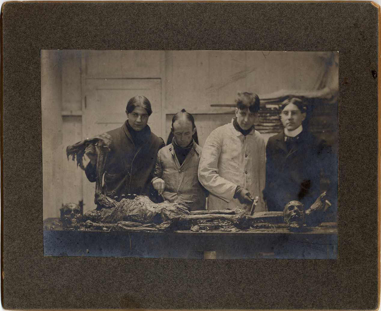 Four men standing behind partially-skeletonized human corpse; one holds up body's arm. One skull at each end of table. Handwritten on mat back: "Morgan Parker, Bert Higgs, Wm. J. Stapleton, Jr., Peter Dodenhoff. Dissecting Room, Michigan College of Medicine & Surgery, 1899."