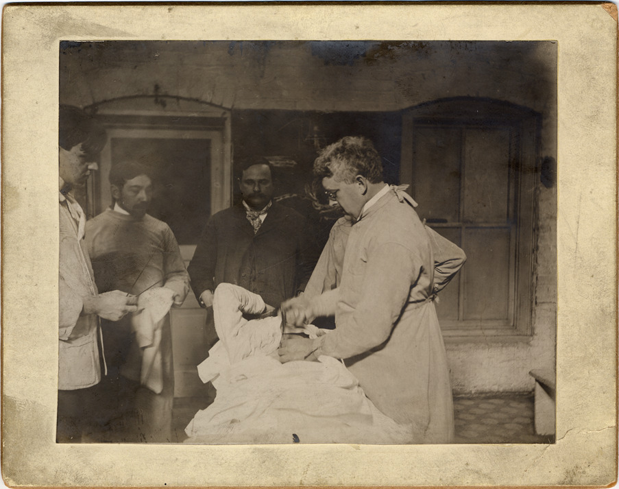 Favorite this☆ Dr. Hal Wyman examining patient Description: Doctor examining patient on operating table; patient looks conscious. At least four men observing. Handwritten on mat back: "Dr. Hal Wyman (Mich. Col. Med. & Surgery) examining patient. W.J. Stapleton - on left." Details Resource ID: DPA2191 Subject: Michigan College of Medicine Medical education--Michigan--Detroit Diagnosis, Surgical--Michigan--Detroit Albumen prints Photographic prints Date Issued: 1899-12-20 Format: 1 photographic print mounted on mat board ; image 4 x 5 in. Member of: Burton Historical Collection Filing Location: D/Colleges & universities-Michigan College of Medicine Rights: Physical rights are retained by DPL. Copyright is retained in accordance with U.S. copyright laws.
