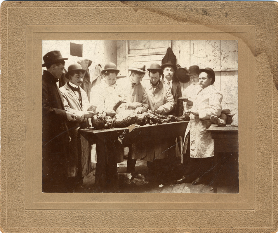 Medical students examining corpse with most of flesh removed. Handwritten on mat back: "Dissecting room - Michigan College Medicine & Surgery, class of 1900. Taken in 1898. Gordon, Sherrard, Bastendorff, Harper, Harper [intentional duplication], Wiley."