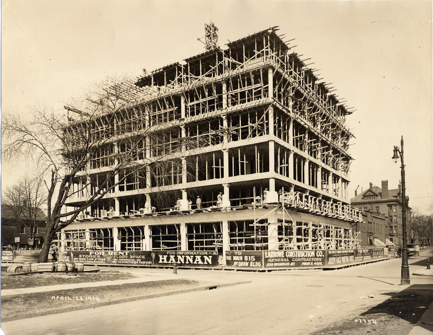 Six story building under construction. Hannan Real Estate, in McGraw Building, built by contractors Larrowe Construction. Written on photograph: "April 23, 1914. 7754." Stamped on photograph back: "Spooner & Wells, Inc., photographers, [1231] Woodward Ave., Detroit, Mich."
