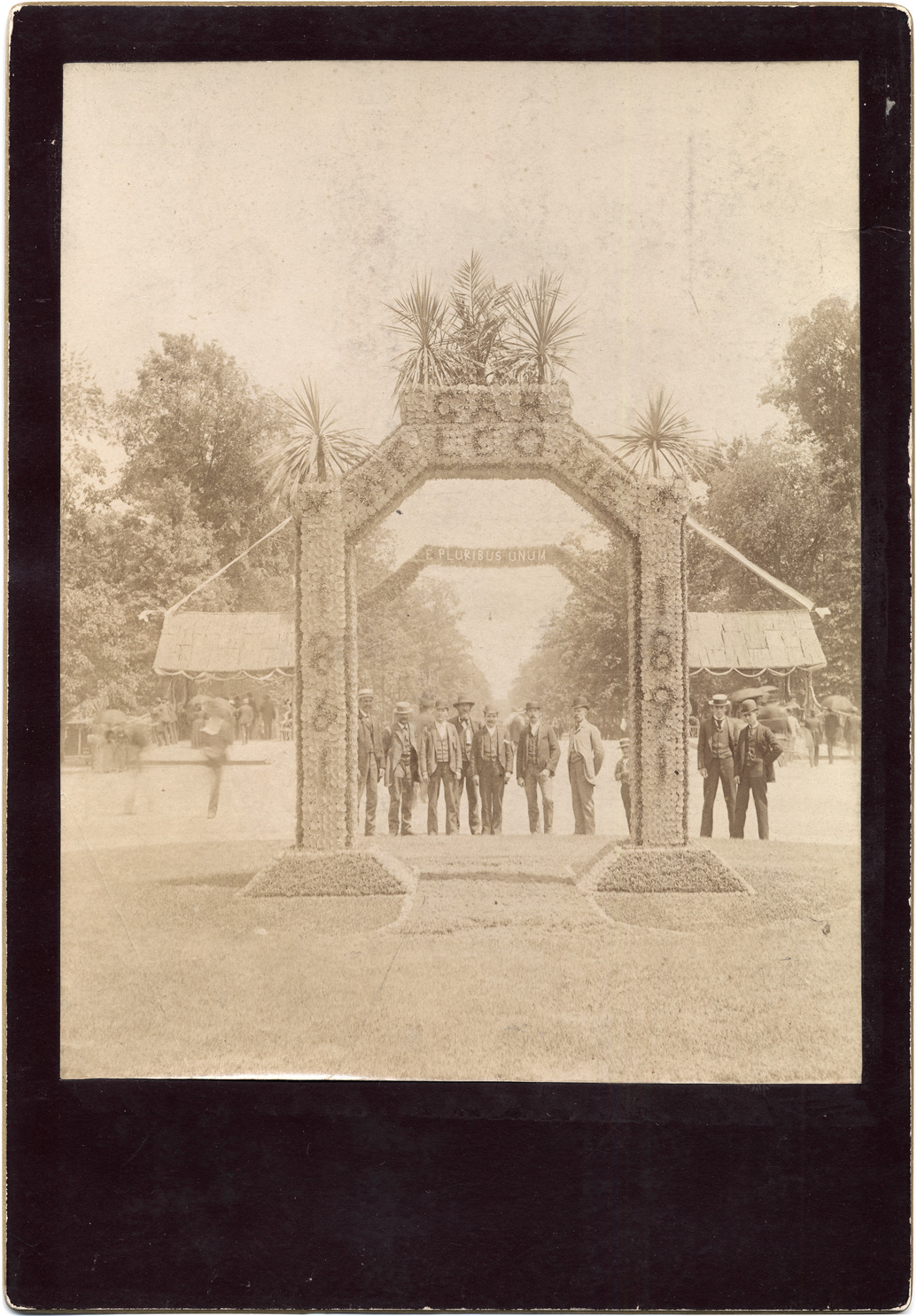 Favorite this☆ Floral arch on Belle Isle welcoming G.A.R. convention Description: Several men standing behind floral arch which reads "G.A.R. welcome, 1861-1891." Handwritten on mat back: "Belle Isle. Gibson, photo., Ann Arbor, M." Details Resource ID: DPA2209 Creator: Gibson, J. Jefferson Subject: Grand Army of the Republic. National Encampment Belle Isle Park (Detroit, Mich.) Arches--Michigan--Detroit Photographers--Michigan--Ann Arbor Albumen prints Photographic prints Date Issued: 1891-08 Format: 1 photographic print mounted on mat board ; image 7.75 x 6 in. Member of: Burton Historical Collection Filing Location: D/Conventions-G.A.R. Note (Content): From Charles L. Clark Estate Rights: Physical rights are retained by DPL. Copyright is retained in accordance with U.S. copyright laws.